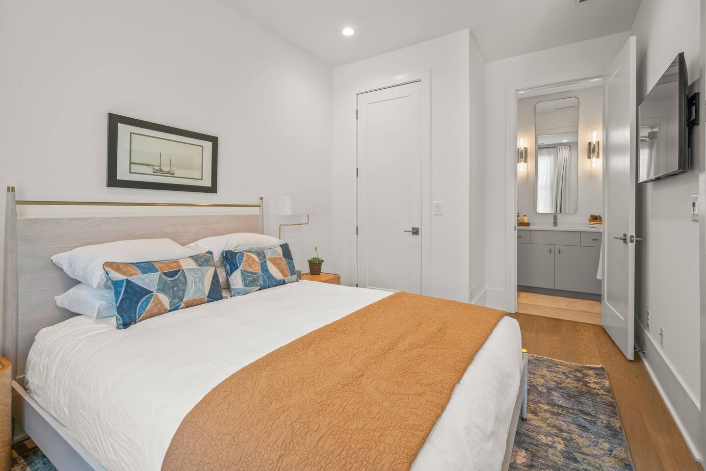 Two ensuite bedrooms are on the top floor and one bedroom and full bathroom are on main level.